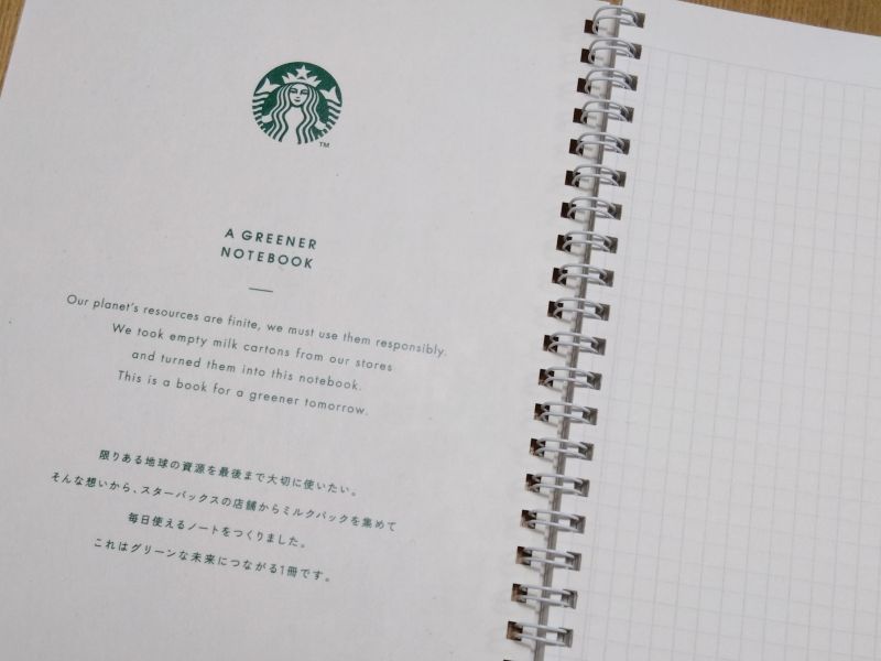A GREENER NOTEBOOKというタイトルで始まり、これはグリーンな未来につながる一冊です、というメッセージが、スターバックスのシンボルカラーであるグリーンで印刷されています。
